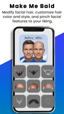 By using hair remover app from photo If you have always wanted to shave your head but lacked the courage to actually do it by using Hair removal photo editor, your time has come by using bald effect! Now you can finally see how you would look with a shaved head by applying the Bald filter app by using ai bald filter! Or, if you don't want to shave your head by using mask bald, apply a bald head sticker to your friends' pictures through this Make me Bald Filter Photo Edit. This Hair removal photo editor for men's hairstyles will show you the results bald effect Enter the virtual barber shop and experiment with your hairstyle by using Bald Head app by using mask bald!