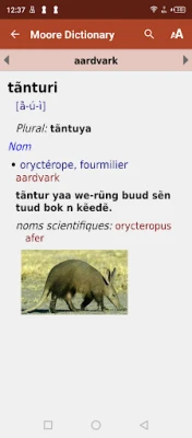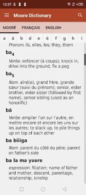 Ce dictionnaire vous permette de découvrir la langue mooré du Burkina Faso. En cliquant sur le bouton de «recherche» (la petite loupe en haut à droite), une fenêtre s’ouvre et vous pouvez taper des mots en mooré, français ou en anglais. Tapez « Recherche » et une nouvelle fenêtre va afficher les résultats. Sélectionnez le mot que vous voulez consulter de proche, et une nouvelle fenêtre va s’ouvrir sur votre écran.